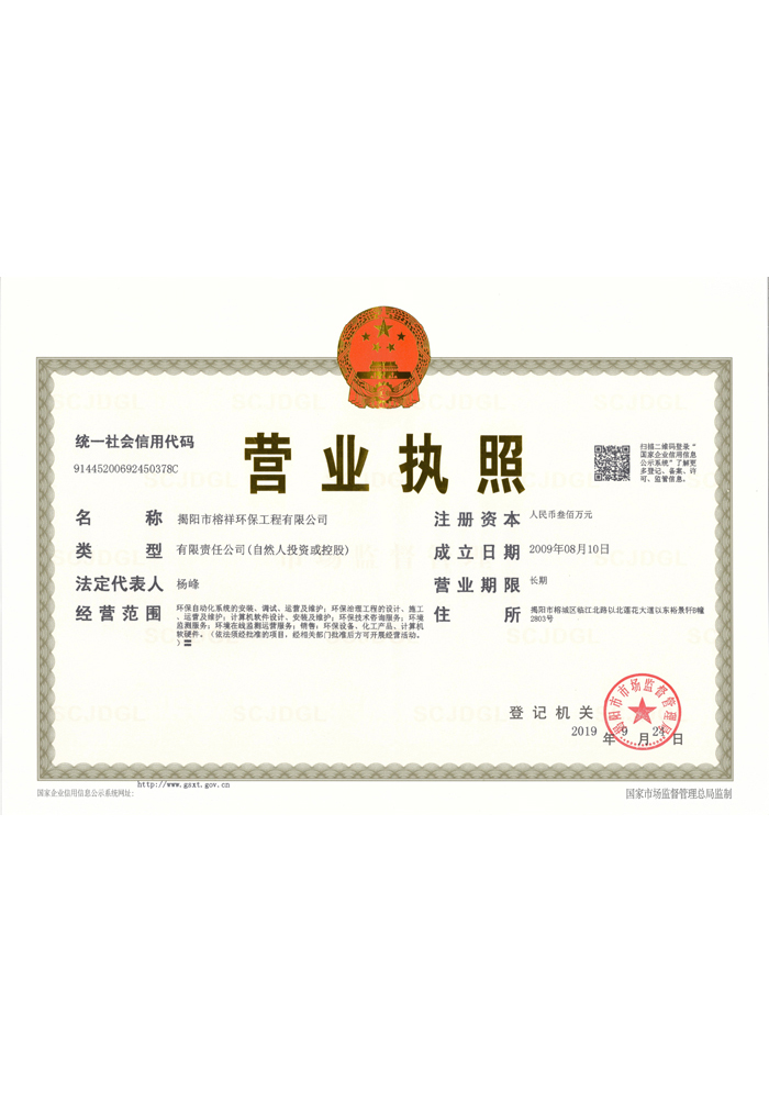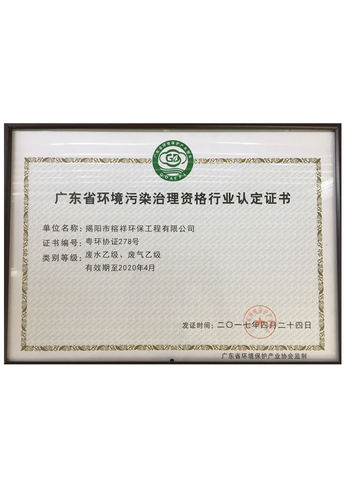 揭陽市榕祥環保工程有限公司成立于2009年,是一家為企業單位提供環保相關服務的專業公司。公司現具有《廣東省環境污染治理資格行業認定證書(廢水、廢氣)》、《環境污染治理設施運營資質(自動連續監測(水))》等資質,是廣東省環境保護產業協會會員、廣東省守合同重信用企業。
